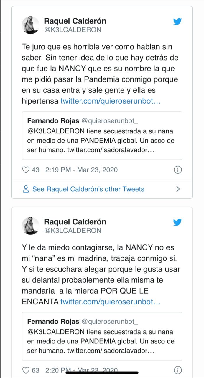 En un primer tuit, la influencer escribió: «Te juro que es horrible ver como hablan sin saber. Sin tener idea de lo que hay detrás de que fue la NANCY que es su nombre la que me pidió pasar la Pandemia conmigo porque en su casa entra y sale gente y ella es hipertensa».